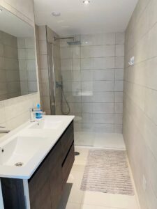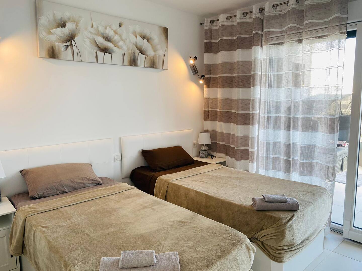 The two bedrooms are designed for comfort, with built-in wardrobes, cotton linens, and blackout curtains. The master bedroom includes an en-suite bathroom, both bathrooms featuring premium finishes and amenities such as a hairdryer, shower gel, and shampoo.