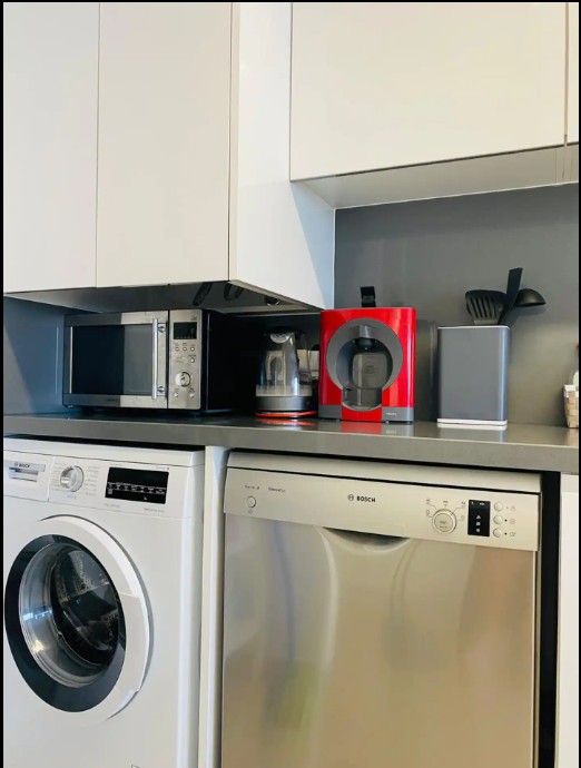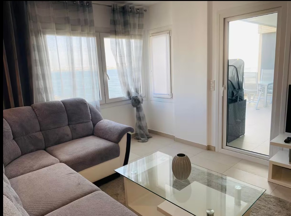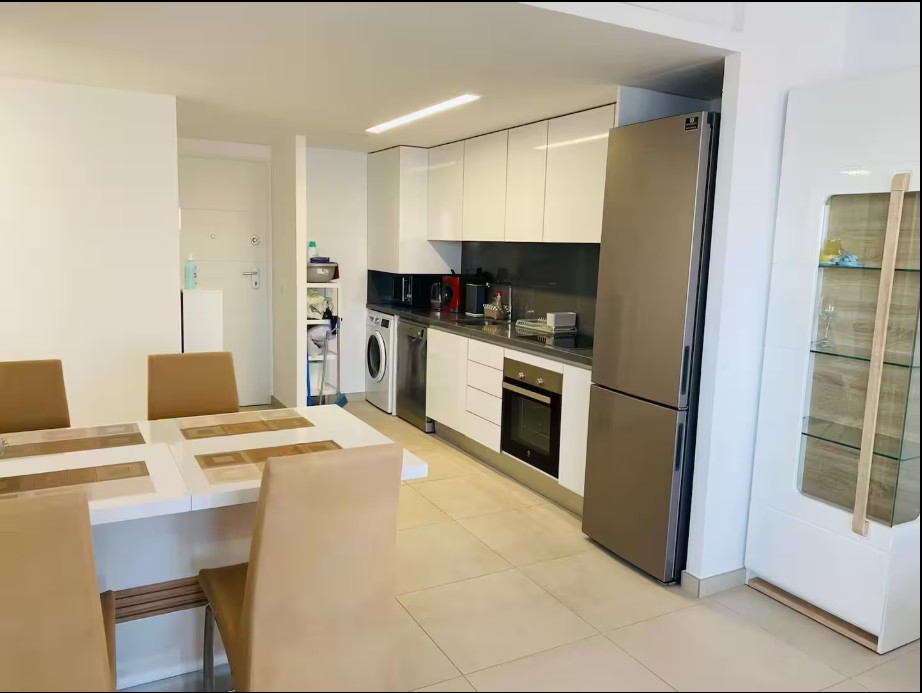The apartment features a large open-plan living and dining area that flows into a fully equipped kitchen with top-quality appliances: dishwasher, oven, coffee maker, and more. From the living room, large glass doors open onto a private terrace with outdoor dining space β perfect for enjoying the sun, sea breeze, and stunning sunsets.